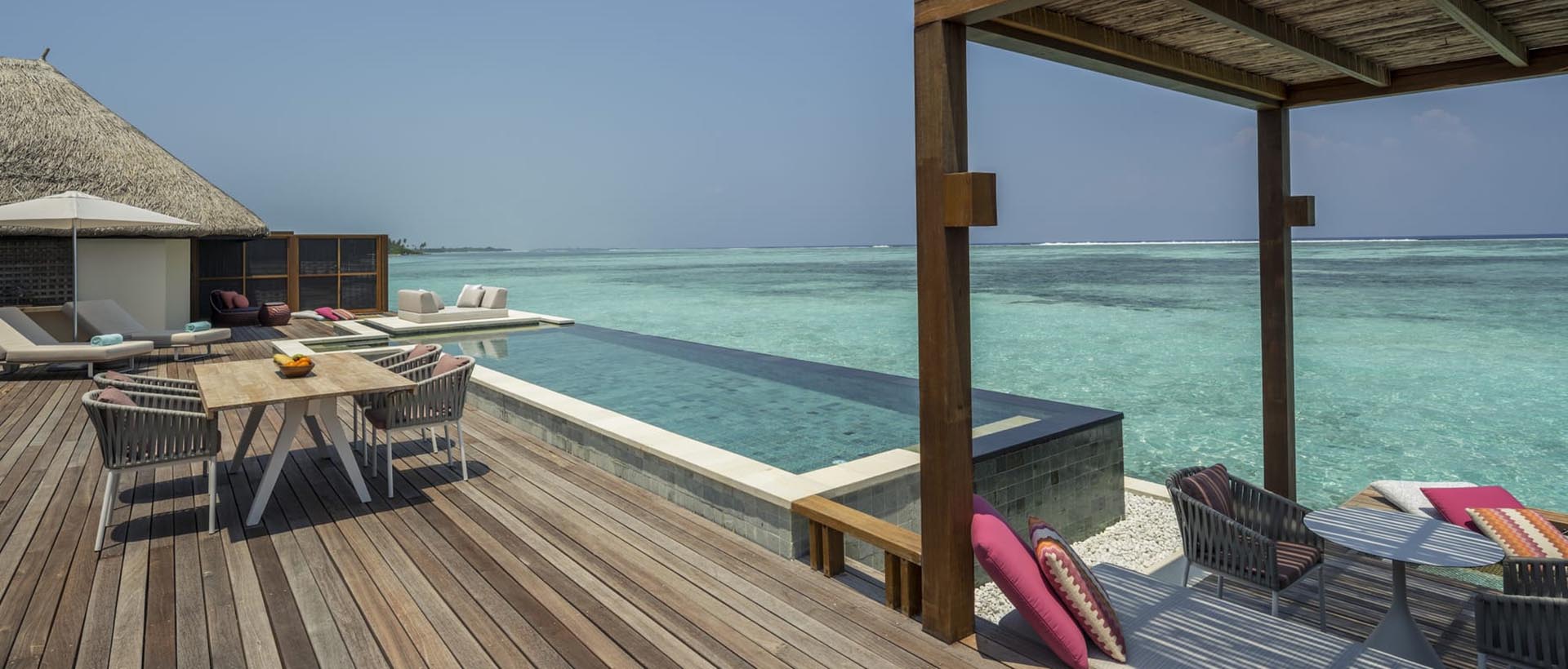 Водные бунгало: 2 спальни, гостиная, большая терраса (199 м²), частный бассейн, обеденная зона на открытом воздухе, нижняя платформа с душем. Прямой спуск в море. При размещении с детьми до 8 лет родители должны подписать специальный документ (Liability Form).